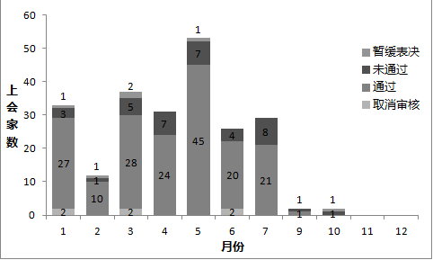 2012年IPO概況 2012年共有225家企業(yè)上會(huì),其中176家通過(guò)審核,37家被否決,6家暫緩表決,6家取消審核。全年過(guò)會(huì)率為78.22%,與2011年76.81%的過(guò)會(huì)率基本持平。然而從上會(huì)公司的數(shù)量來(lái)說(shuō),2011年有345家企業(yè)接受審核,2012年相比2011年下降了三成。主要是2012年8月以來(lái)只有4家企業(yè)上會(huì),數(shù)量銳減。 去年全年共發(fā)行新股150只,實(shí)際募集資金約926億元。對(duì)比2011年,新股發(fā)行數(shù)量縮減了近46%,募集資金更是大幅縮水64%。IPO節(jié)奏放緩的同時(shí),企業(yè)上市熱情卻依舊不減。截至2013年1月4日,有882家企業(yè)排隊(duì)等候上市。 圖1 2012年上市公司審核結(jié)果分布
